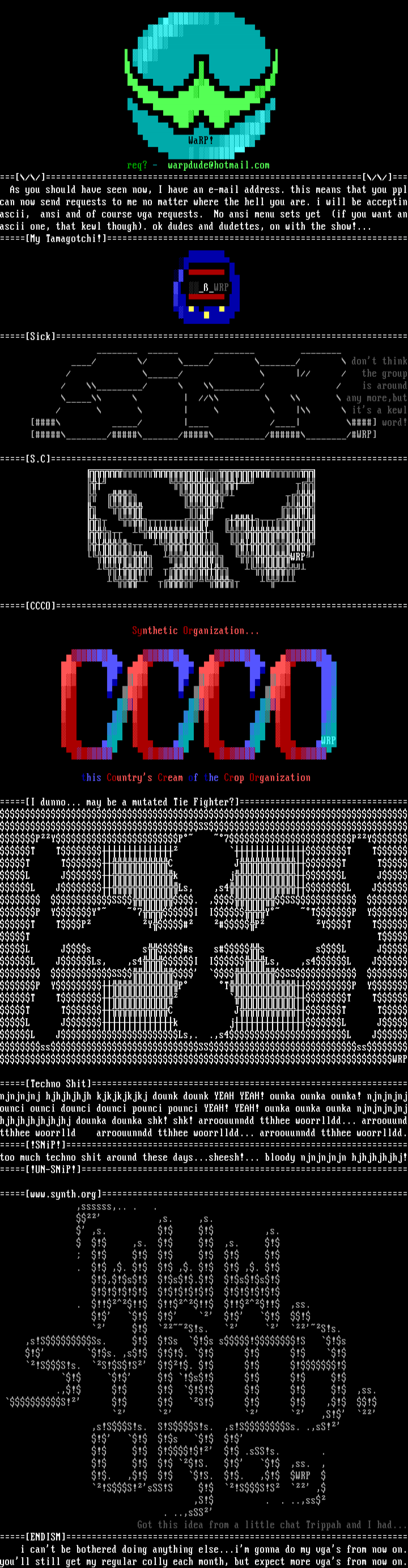 As you should have seen now, I have an e-mail address. this means that you pplcan now send requests to me no matter where the hell you are. i will be acceptinascii, ansi and of course vga requests. No ansi menu sets yet if you want anascii one, that kewl though. ok dudes and dudettes, on with the show!...