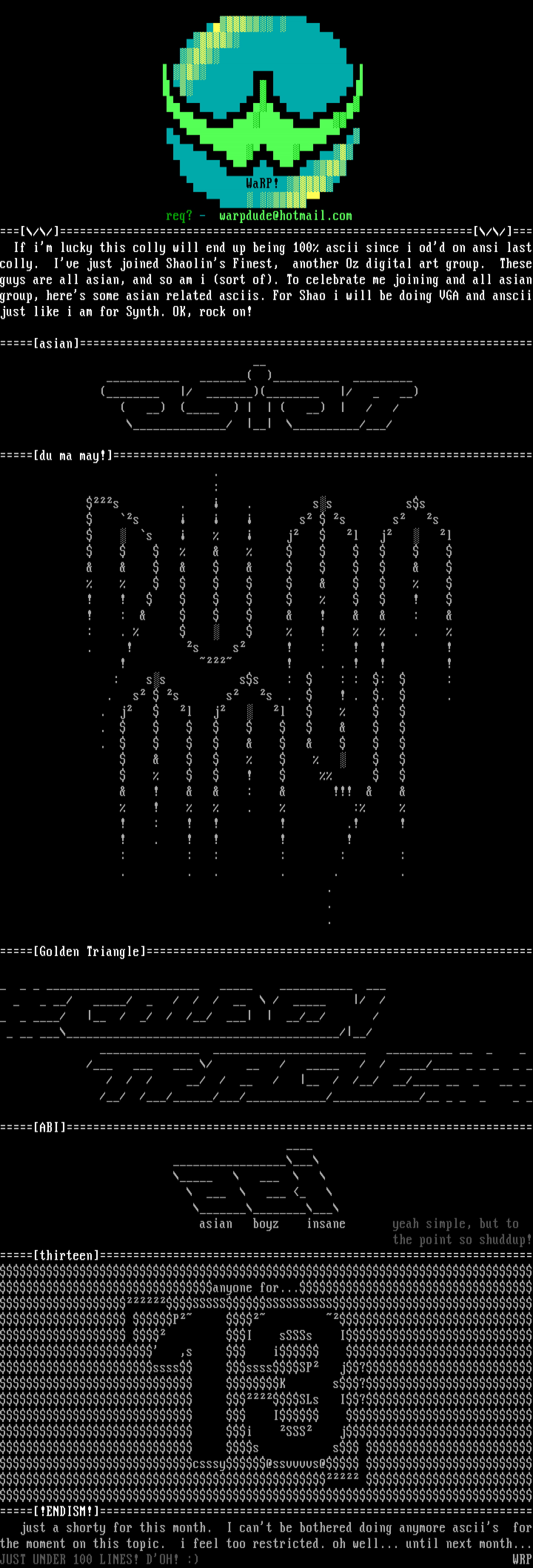 If im lucky this colly will end up being 100 ascii since i odd on ansi lastcolly. Ive just joined Shaolins Finest, another Oz digital art group. Theseguys are all asian, and so am i sort of. To celebrate me joining and all asiangroup, heres some asian related asciis. For Shao i will be doing VGA and ansciijust like i am for Synth. OK, rock on!
