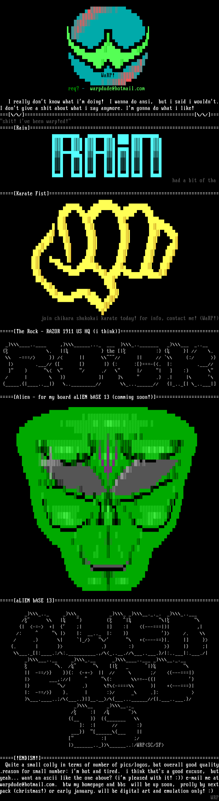 !ENDISM! Quite a small colly in terms of number of pics/logos, but overall good quality.reason for small number: im hot and tired. i think thats a good excuse, butyeah... want an ascii like the one above? im pleased with it! : e-mail me atwarpdude@hotmail.com. btw my homepage and bbs will be up soon, prolly by nextpack christmas! or early january. will be digital art and emulation only! :