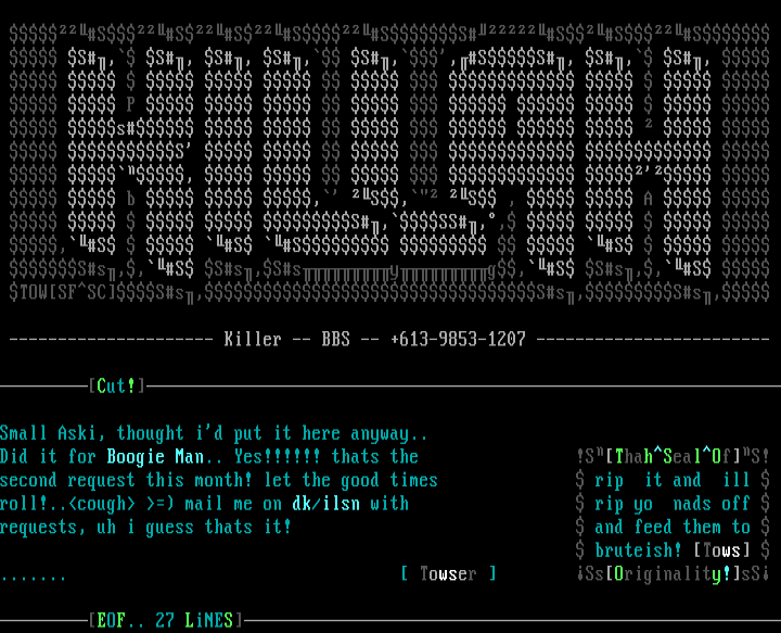 --------------------- Killer -- BBS -- +613-9853-1207 ------------------------