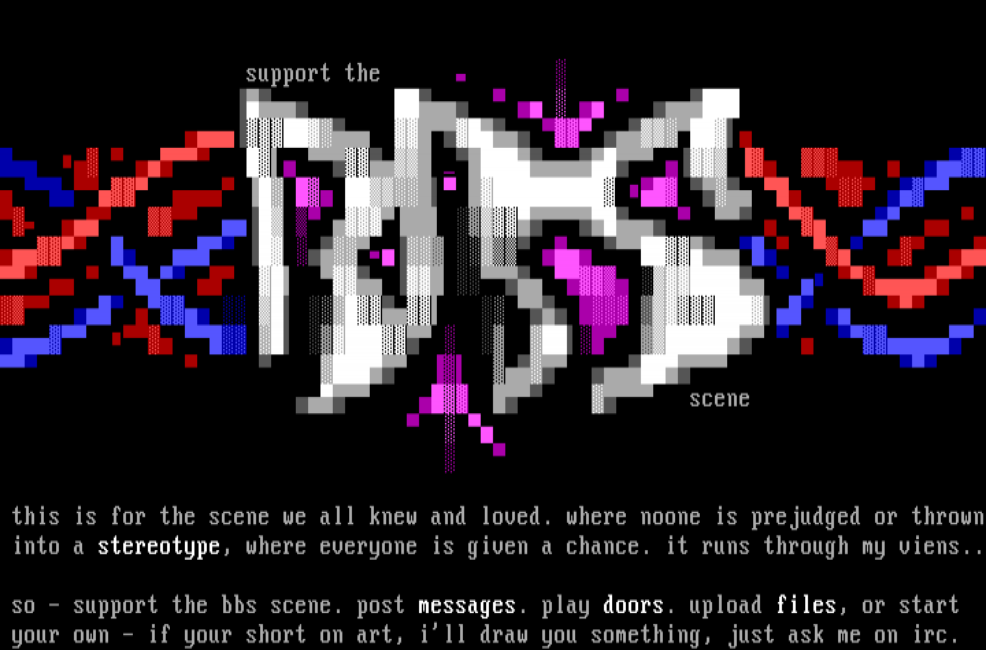 so - support the bbs scene. post messages. play doors. upload files, or start