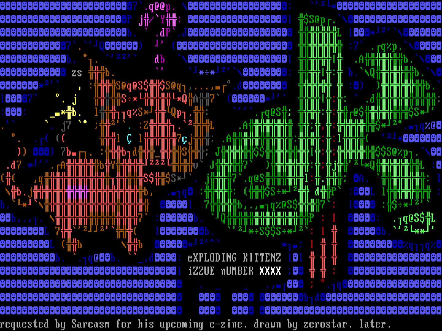 L b b * *: l qqb. .q@b. ,d: eXPLODING KITTENZ ll l iZZUE nUMBER XXXX : . ., .q bd requested by Sarcasm for his upcoming e-zine. drawn by zerostar. later.