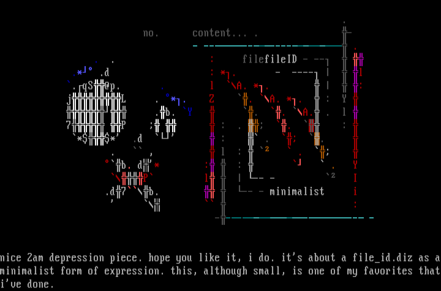 nice 2am depression piece. hope you like it, i do. its about a fileid.diz as aminimalist form of expression. this, although small, is one of my favorites thative done.