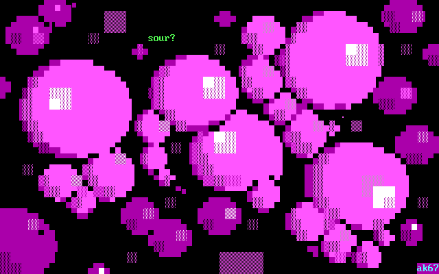 grapefrom grapes. Inspired by the Showdown competitions, this was in challenge to Tainted, his entry is https://16colo.rs/pack/thesauna02/tnt-grap.ans. Safe to assume he won this round.log in to add a comment.