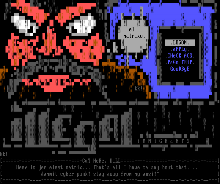 ------------CuT HeRe, DiLL------------- Heer is jer eleet matrix... Thats all I have ta say bout that.... dammit cyber punk! stay away from my ansi!! ------------------------------------