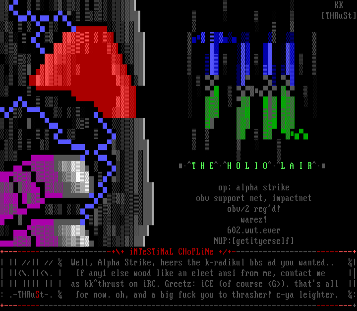 +------------------------++ iNTeSTiNaL CHoPLiNe +/+---------------------------+ // // Well, Alpha Strike, heers the k-radikul bbs ad you wanted.. .. If any1 else wood like an eleet ansi from me, contact me as kkthrust on iRC. Greetz: iCE of course G. thats all : .-THRuSt-. for now. oh, and a big fuck you to thrasher! c-ya leighter. :+------------------------------------------------------------------------------+