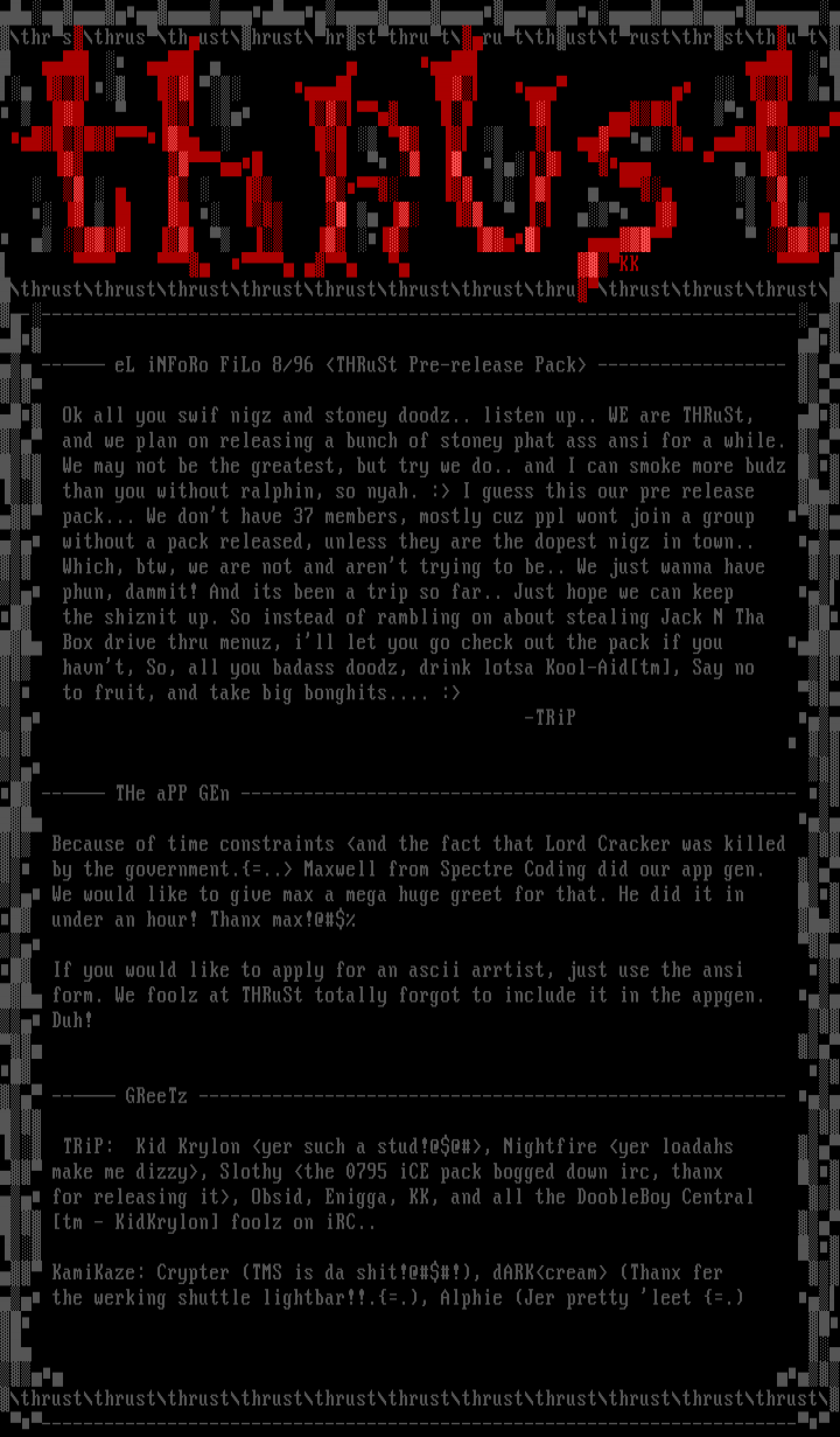 KK thrustthrustthrustthrustthrustthrustthrustthruthrustthrustthrust-------------------------------------------------------------------------- -- eL iNFoRo FiLo 8/96 THRuSt Pre-release Pack ------------------ Ok all you swif nigz and stoney doodz.. listen up.. WE are THRuSt, and we plan on releasing a bunch of stoney phat ass ansi for a while. We may not be the greatest, but try we do.. and I can smoke more budz than you without ralphin, so nyah. : I guess this our pre release pack... We dont have 37 members, mostly cuz ppl wont join a group without a pack released, unless they are the dopest nigz in town.. Which, btw, we are not and arent trying to be.. We just wanna have phun, dammit! And its been a trip so far.. Just hope we can keep the shiznit up. So instead of rambling on about stealing Jack N Tha Box drive thru menuz, ill let you go check out the pack if you havnt, So, all you badass doodz, drink lotsa Kool-Aidtm, Say no to fruit, and take big bonghits.... : -TRiP -- THe aPP GEn ----------------------------------------------------- Because of time constraints and the fact that Lord Cracker was killed by the government... Maxwell from Spectre Coding did our app gen. We would like to give max a mega huge greet for that. He did it in under an hour! Thanx max!@ If you would like to apply for an ascii arrtist, just use the ansi form. We foolz at THRuSt totally forgot to include it in the appgen. Duh! -- GReeTz -------------------------------------------------------- TRiP: Kid Krylon yer such a stud!@@, Nightfire yer loadahs make me dizzy, Slothy the 0795 iCE pack bogged down irc, thanx for releasing it, Obsid, Enigga, KK, and all the DoobleBoy Central tm - KidKrylon foolz on iRC.. KamiKaze: Crypter TMS is da shit!@!, dARKcream Thanx fer the werking shuttle lightbar!!.., Alphie Jer pretty leet . thrustthrustthrustthrustthrustthrustthrustthrustthrustthrustthrust ------------------------------------------------------------------------