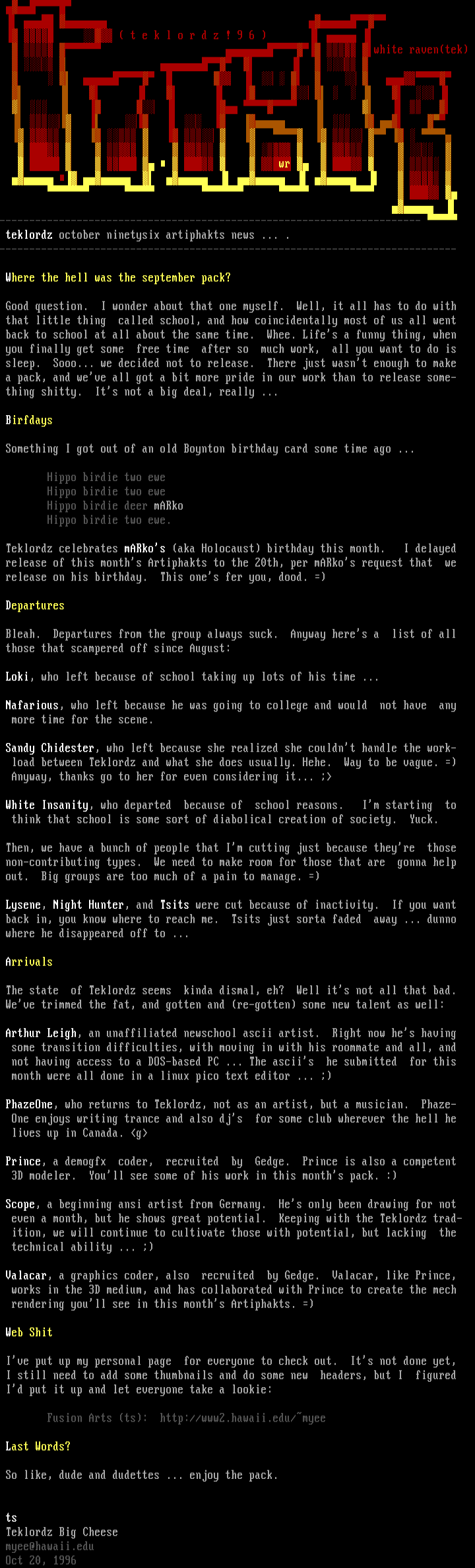 teklordz october ninetysix artiphakts news ... .