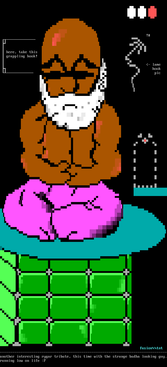 fusiontnt--------------------------------------------------------------------------------another interesting rygar tribute, this time with the strange budha looking guy.running low on life :P