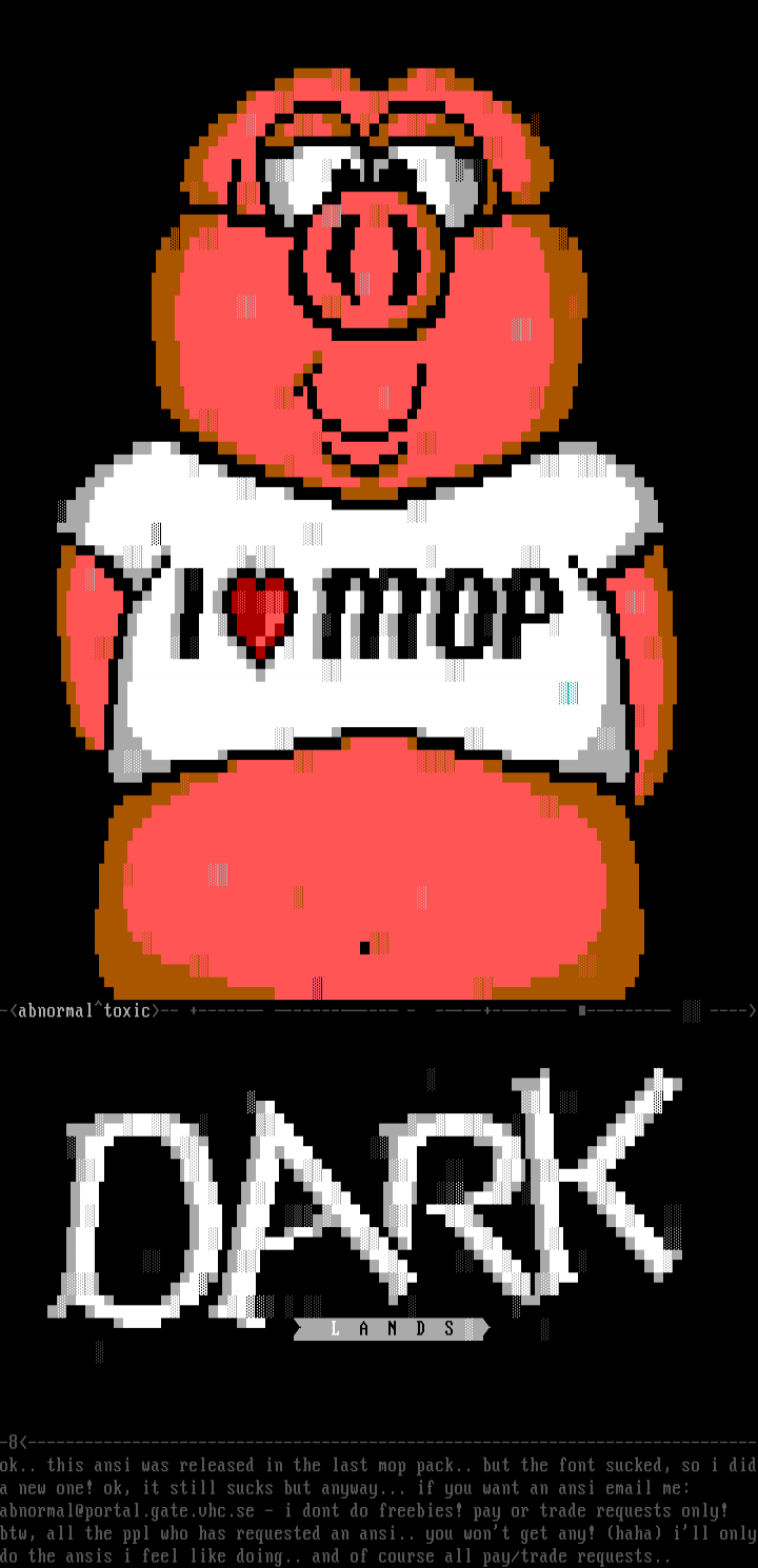 -8-----------------------------------------------------------------------------ok.. this ansi was released in the last mop pack.. but the font sucked, so i dida new one! ok, it still sucks but anyway... if you want an ansi email me: