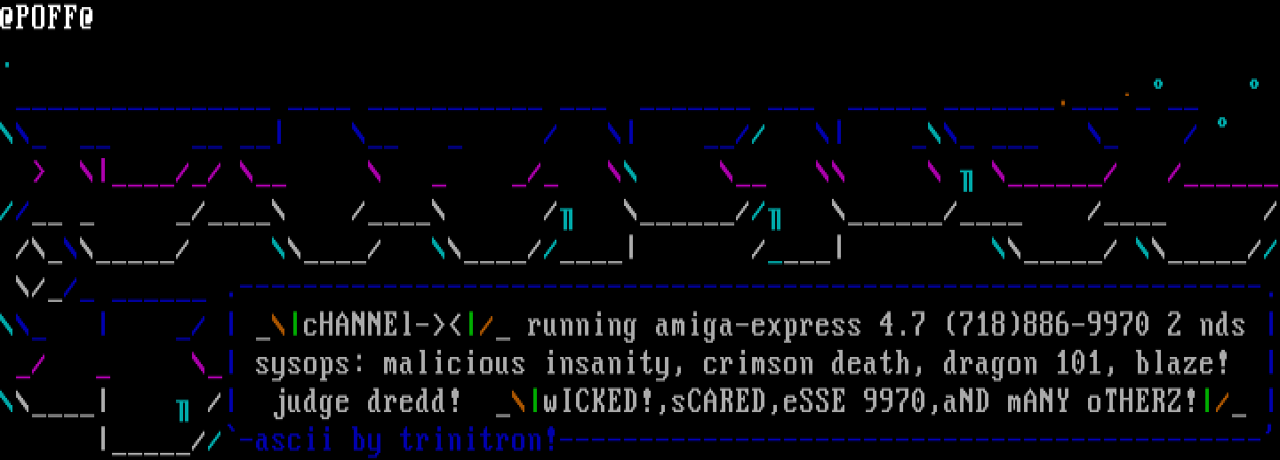 // / / / / / // / / / // / // / / // // .----------------------------------------------------------------. / cHANNEl-/ running amiga-express 4.7 718886-9970 2 nds / sysops: malicious insanity, crimson death, dragon 101, blaze! / judge dredd! wICKED!,sCARED,eSSE 9970,aND mANY oTHERZ!/ //-ascii by trinitron!--------------------------------------------
