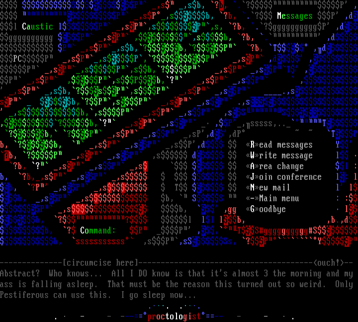 l Caustic lP ,sP,sP,s, ?b, .?ggggggggggP ,dgggggggggg P ,sP ,,sb, ?b, . ,d P ,sP,sb,?b,?P ?b, T ,dPCP ,sP,sP,?P ,sP ,d ,P ,sP,sP,sb,?P ,sP ,sPT ,P ,sP ,P,sPb,? ,sP ,sP , ,sP ,sb,?sP,sP ,sP ,sP .,ssP b,?P,sP ,sP ,sP .,sS ,sb,,sP ,sP ,sP ,sSS,?b,? ,sP ,sP ,P,sssss,..T ?b, ?P ,sP ,sP ,sP,d,dP TPb, ?b, ,sP ,sP ,sP,d Read messages Y ?b, ?P ,sP ,sP ,s d Write message l ?b, ? ,sP ,sP ,s Area change l :b, ?b,,sP ,sP ,s Join conference l: lb, ?P ,sP ,s T New mail l lb, ,sP ,s b, SS -Main menu : :P ,s b, ,gg Goodbye lb, ?? l ll lb, ,b.,db, ? Command: P P ,,TSggggggggggSb, sssssssssss ,sP,sSSs, ?PYP