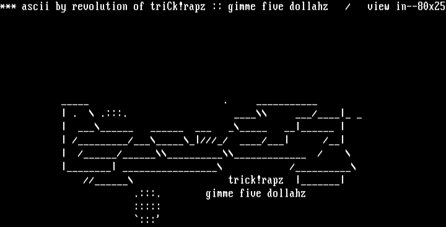 *** ascii by revolution of triCk!rapz :: gimme five dollahz / view in--80x25