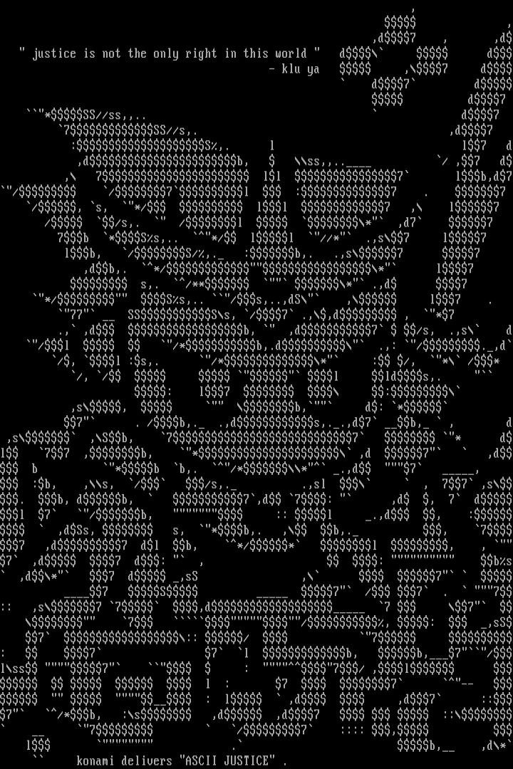 :b, ,s, / /s,. .,sl , 77 ,s. b, db, 7,d 7: ,d , 7 dl 7 /b, :: l .,d , : ,dSs, s, *b,. , b,. , 77 ,d7 dl b, */* l , , 7 ,d 7 d: , : bs ,d* 7 d ,sS , 7 7 S 7 / 7 . 7:: ,s7 7 ,d 7 7 7 /, : ,sS 7 :: / 7 : 7 7 l b, b,7/lss 7 : 7/ ,l l : 7 7 -- : l ,d ,d7 ::7 /*b, :s ,d ,d7 :: 7 /7 :::: , l . b, ,d* konami delivers ASCII JUSTICE .