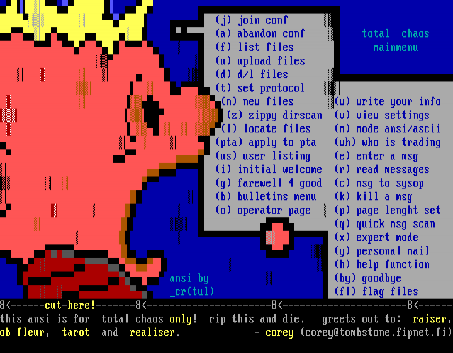 crtul fl flag files8------cut-here!-------8----------------------8----------------------8------this ansi is for total chaos only! rip this and die. greets out to: raiser,ob fleur, tarot and realiser. - corey corey@tombstone.fipnet.fi