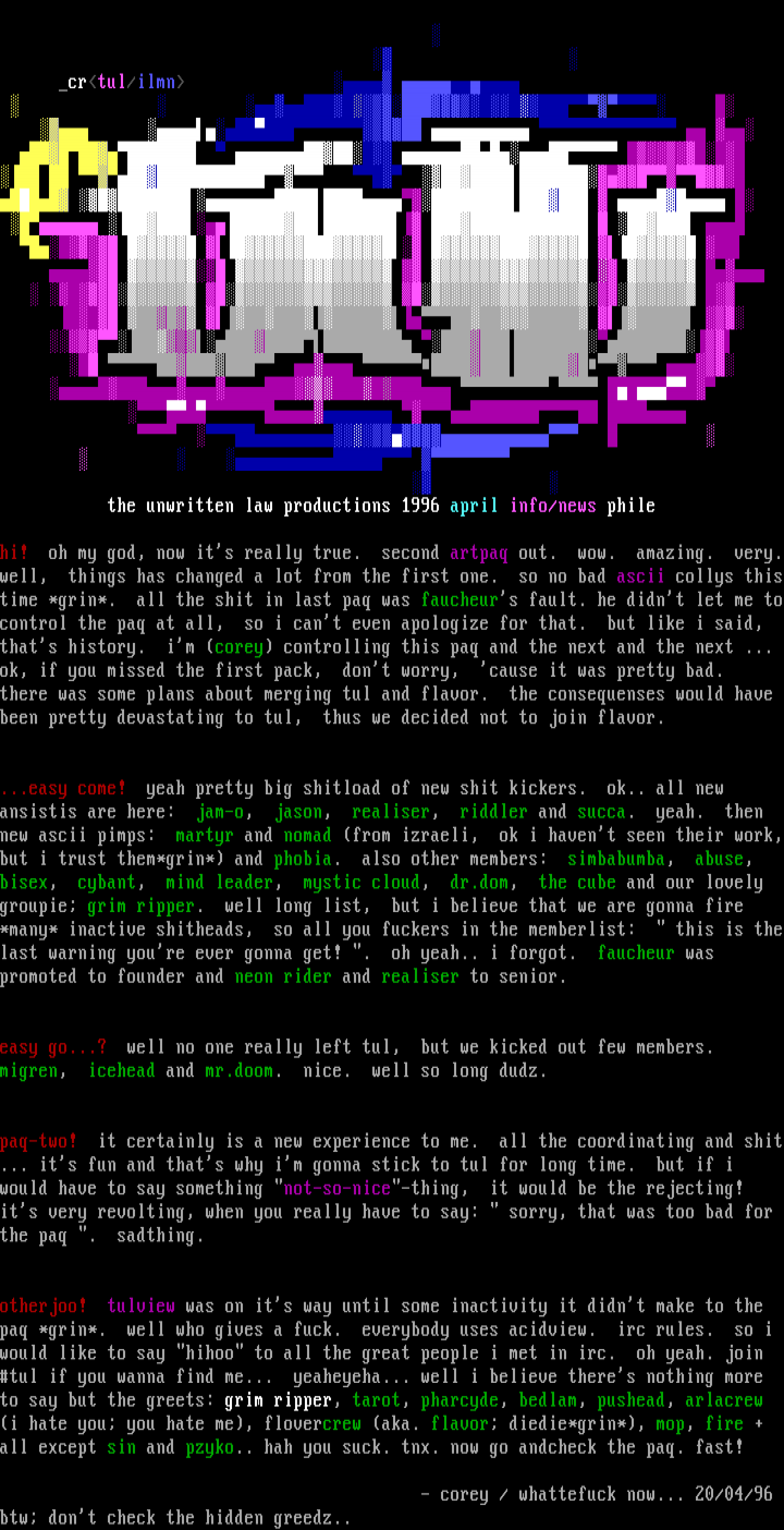 hi! oh my god, now its really true. second artpaq out. wow. amazing. very.well, things has changed a lot from the first one. so no bad ascii collys thistime *grin*. all the shit in last paq was faucheurs fault. he didnt let me tocontrol the paq at all, so i cant even apologize for that. but like i said,