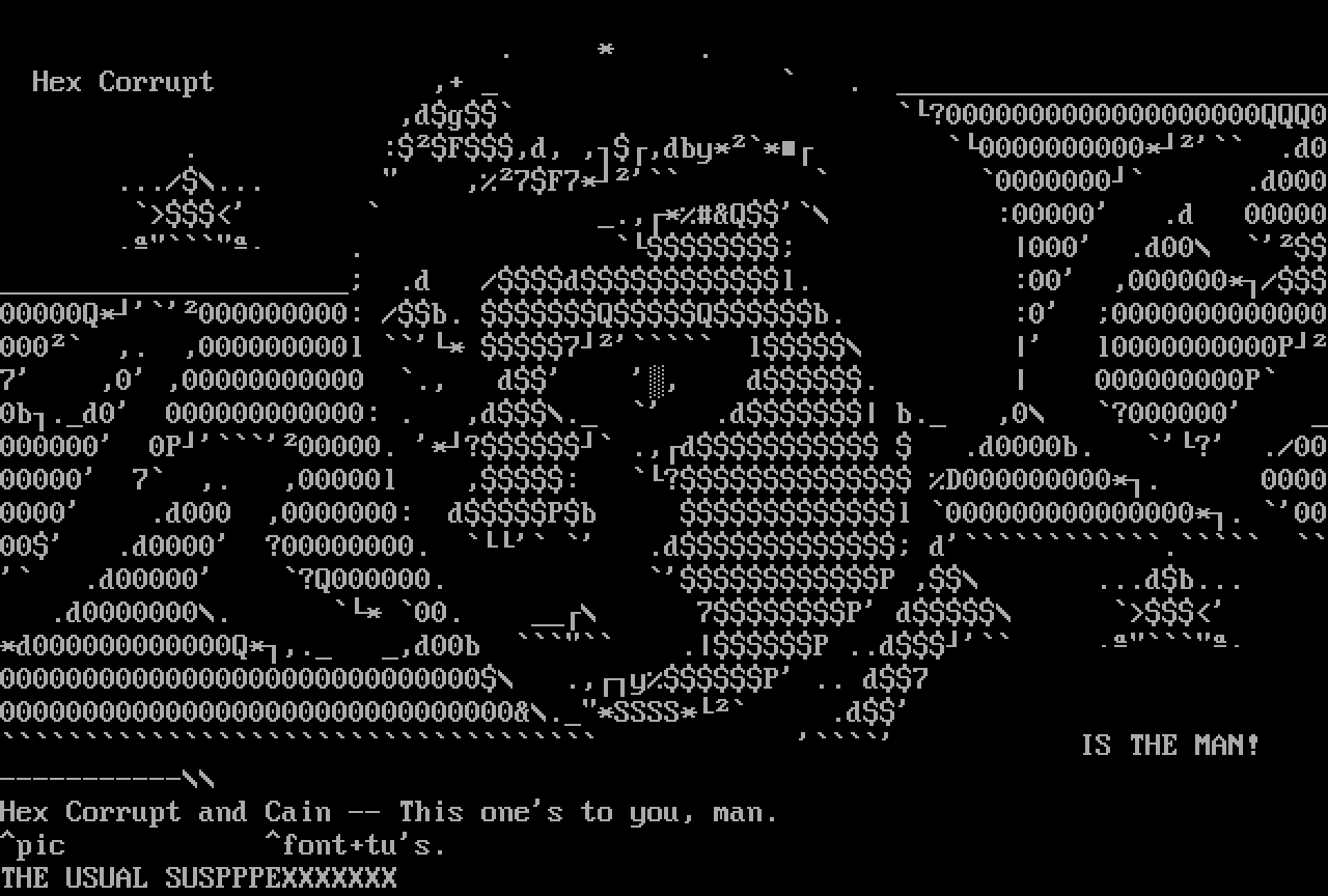 Hex Corrupt ,+ . ,dg ?0000000000000000000QQQ0 . :F,d, ,,dby** 0000000000* .d0 .../... ,7F7* 0000000 .d000 .,*Q :00000 .d 00000 . 000 .d00 .d /dl. :00 ,000000*/00000Q*000000000: /b. QQb. :0 0000000000000000 ,. ,000000000l * 7 l l0000000000P7 ,0 ,00000000000 ., d , d. 000000000P