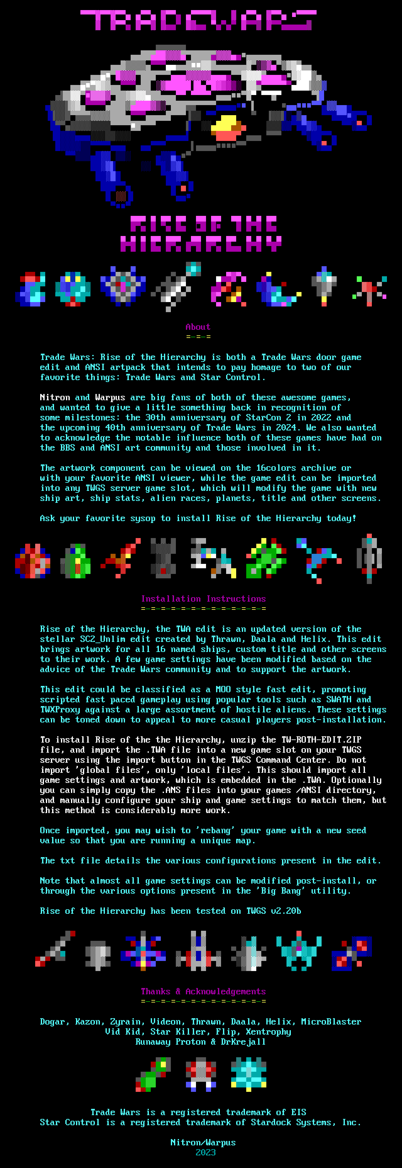 To install Rise of the the Hierarchy, unzip the TW-ROTH-EDIT.ZIP
