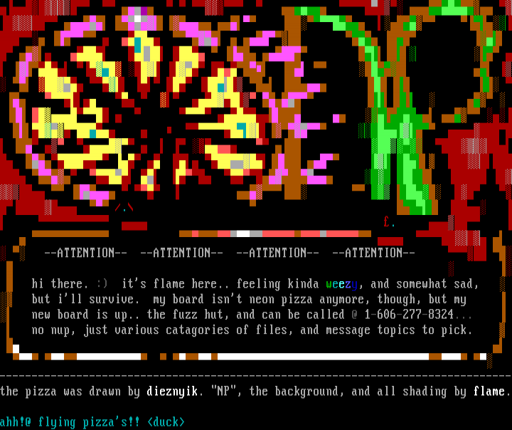 new board is up.. the fuzz hut, and can be called @ 1-606-277-8324... no nup, just various catagories of files, and message topics to pick.