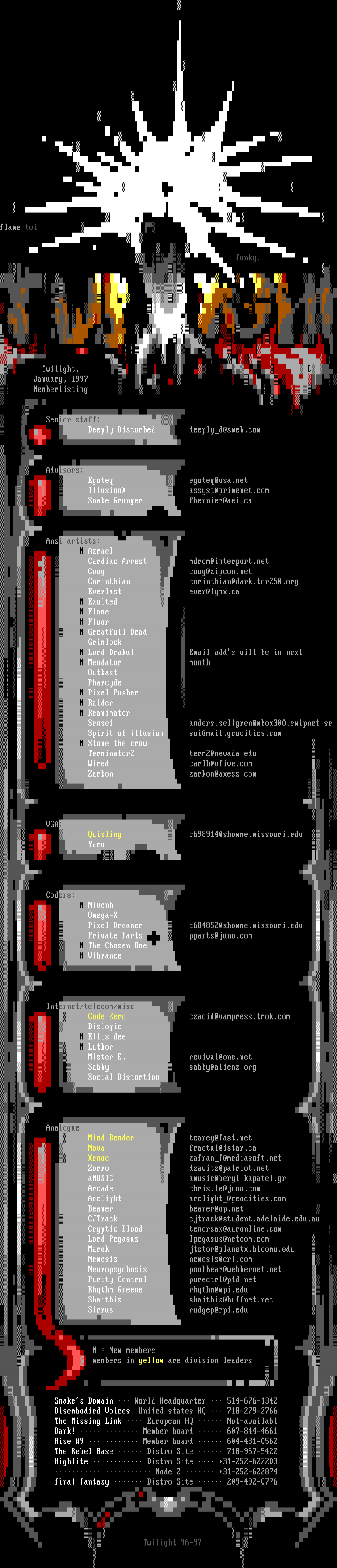 Quisling c698914@showme.missouri.edu Yaro Coders: NNivenh Omega-X Pixel Dreamer c684852@showme.missouri.edu Private Parts pparts@juno.com NThe Chosen One NVibrance Internet/telecom/misc Code Zero czacid@vampress.tmok.com Dislogic N Ellis dee N Luthor Mister E. revival@one.net Sabby sabby@alienz.org Social Distortion Analogue Mind Bender tcarey@fast.net Nova fractal@istar.ca