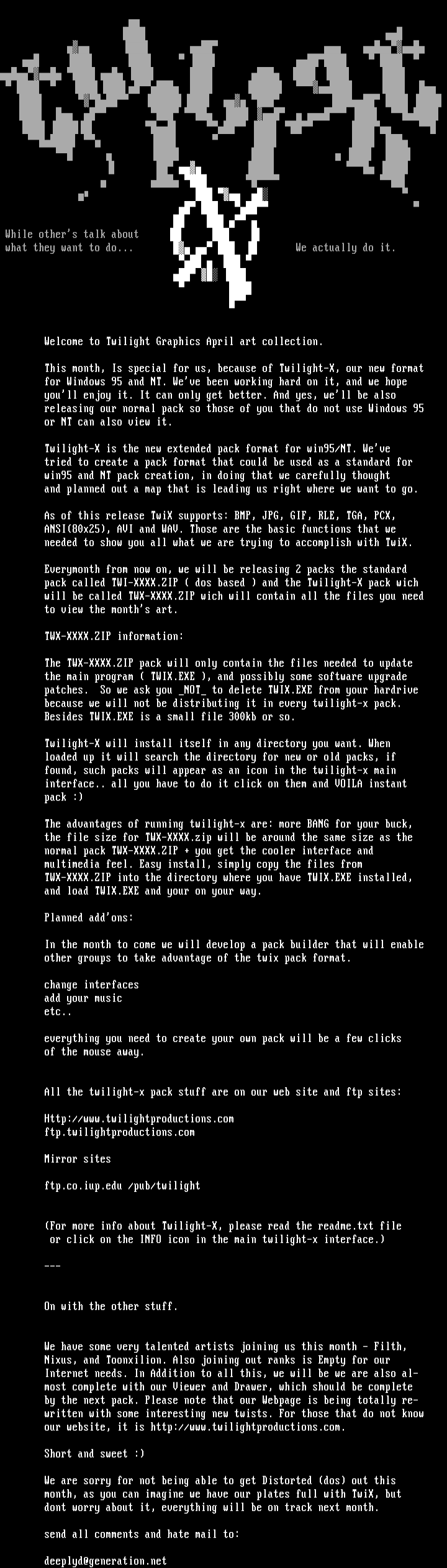 Twilight-X is the new extended pack format for win95/NT. Weve