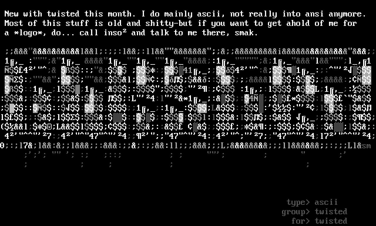 New with twisted this month. I do mainly ascii, not really into ansi anymore.