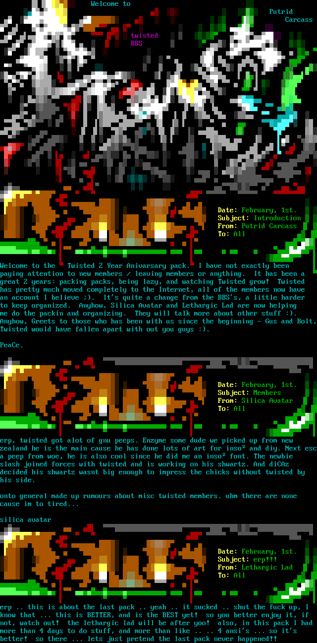 Date: February, 1st. Subject: Introduction From: Putrid Carcass To: All Welcome to the Twisted 2 Year Anivarsary pack. I have not exactly been paying attention to new members / leaving members or anything. It has been a great 2 years: packing packs, being lazy, and watching Twisted grow! Twisted