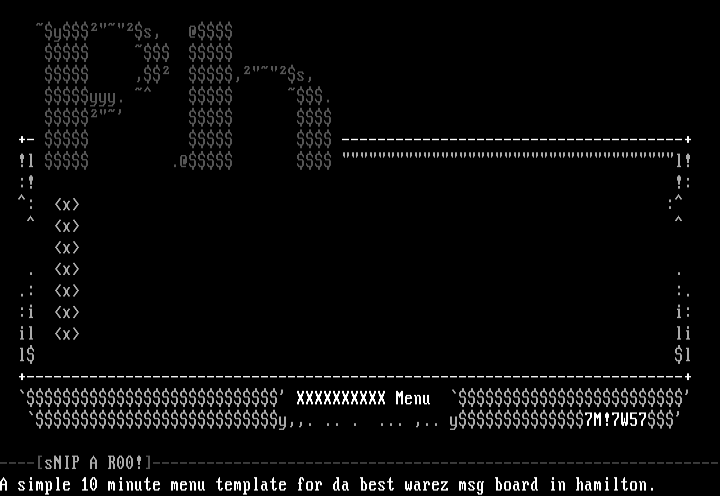 ----sNIP A R00!---------------------------------------------------------------A simple 10 minute menu template for da best warez msg board in hamilton.