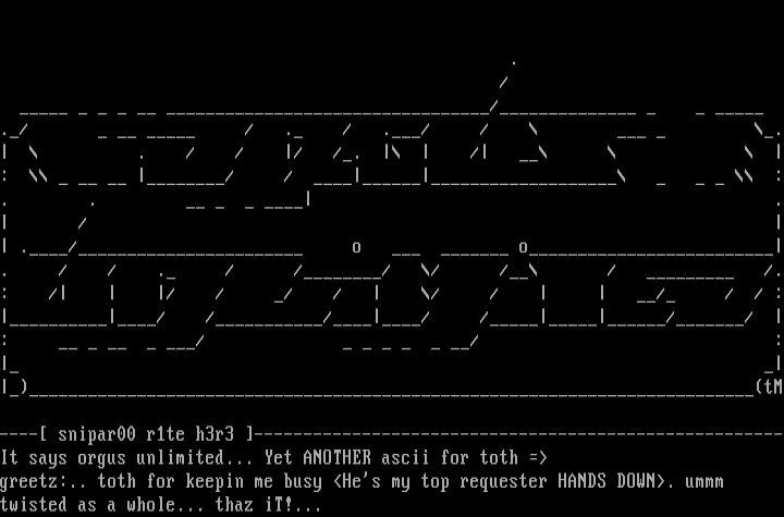 ---- snipar00 r1te h3r3 ------------------------------------------------------It says orgus unlimited... Yet ANOTHER ascii for toth