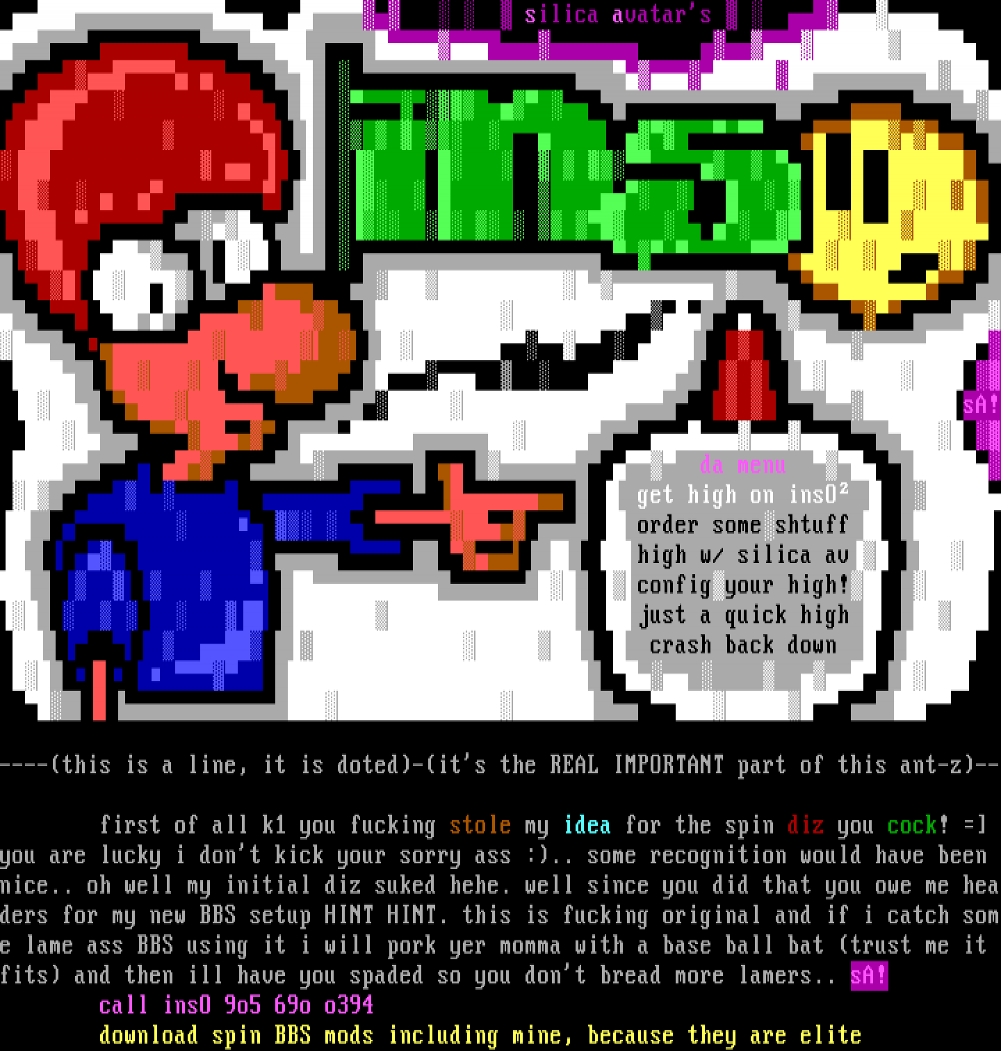 you are lucky i dont kick your sorry ass :.. some recognition would have been nice.. oh well my initial diz suked hehe. well since you did that you owe me headers for my new BBS setup HINT HINT. this is fucking original and if i catch some lame ass BBS using it i will pork yer momma with a base ball bat trust me it