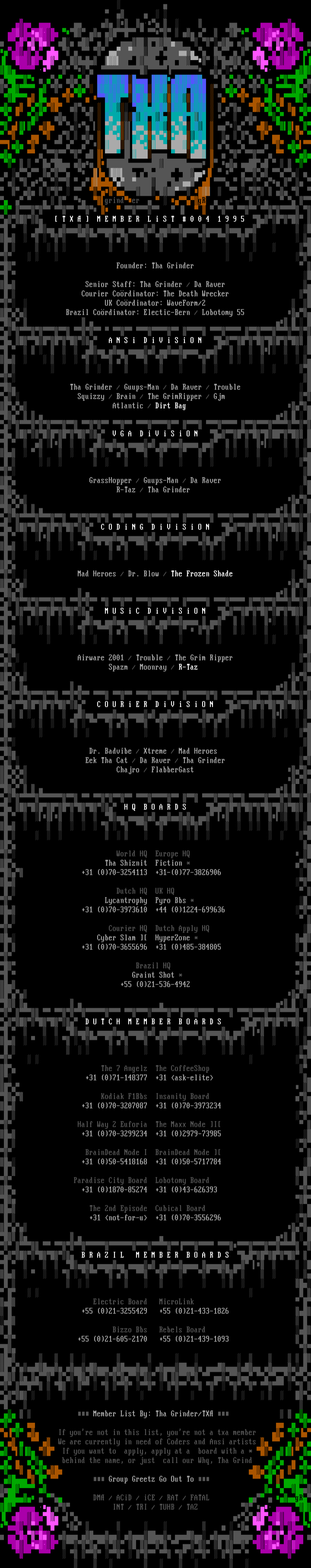 grinder gR T X M E M B E R L i S T 0 0 4 1 9 9 5 Founder: Tha Grinder Senior Staff: Tha Grinder / Da Raver Courier Cordinator: The Death Wrecker UK Cordinator: WaveForm/2 Brazil Cordinator: Electic-Bern / Lobotomy 55 A N S i D i V i S i O N Tha Grinder / Guups-Man / Da Raver / Trouble Squizzy / Brain / The GrimRipper / Gjm Atlantic / Dirt Bag V G A D i V i S i O N GrassHopper / Guups-Man / Da Raver R-Taz / Tha Grinder C O D i N G D i V i S i O N Mad Heroes / Dr. Blow / The Frozen Shade M U S i C D i V i S i O N Airware 2001 / Trouble / The Grim Ripper Spazm / Moonray / R-Taz C O U R i E R D i V i S i O N Dr. Badvibe / Xtreme / Mad Heroes Eek Tha Cat / Da Raver / Tha Grinder Chajro / FlabberGast H Q B O A R D S World HQ Europe HQ Tha Shiznit Fiction * +31 070-3254113 +31-077-3826906 Dutch HQ UK HQ Lycantrophy Pyro Bbs *