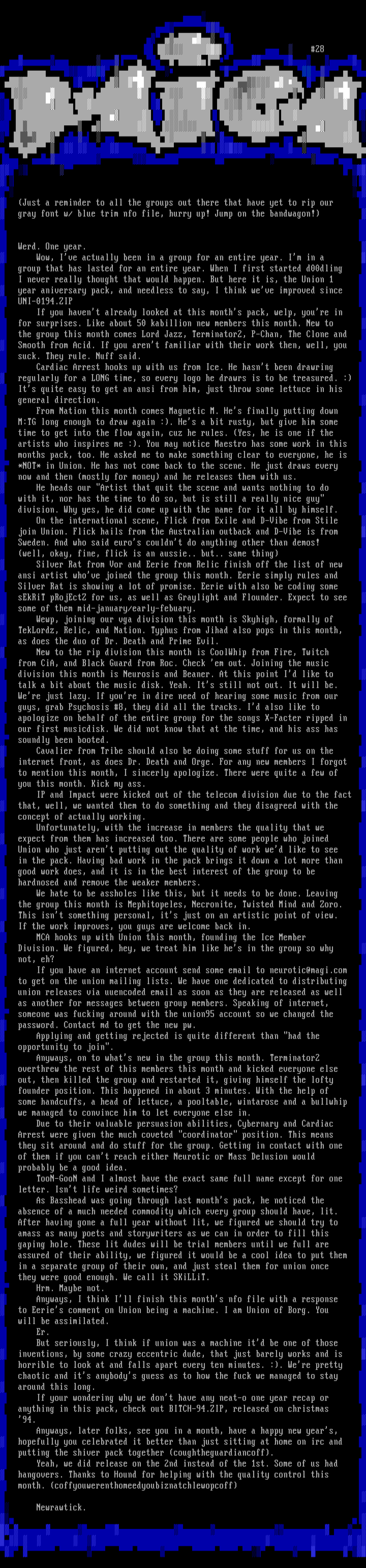 Division. We figured, hey, we treat him like hes in the group so why not, eh? If you have an internet account send some email to neurotic@magi.com to get on the union mailing lists. We have one dedicated to distributing union releases via uuencoded email as soon as they are released as well as another for messages between group members. Speaking of internet, someone was fucking around with the union95 account so we changed the password. Contact md to get the new pw.