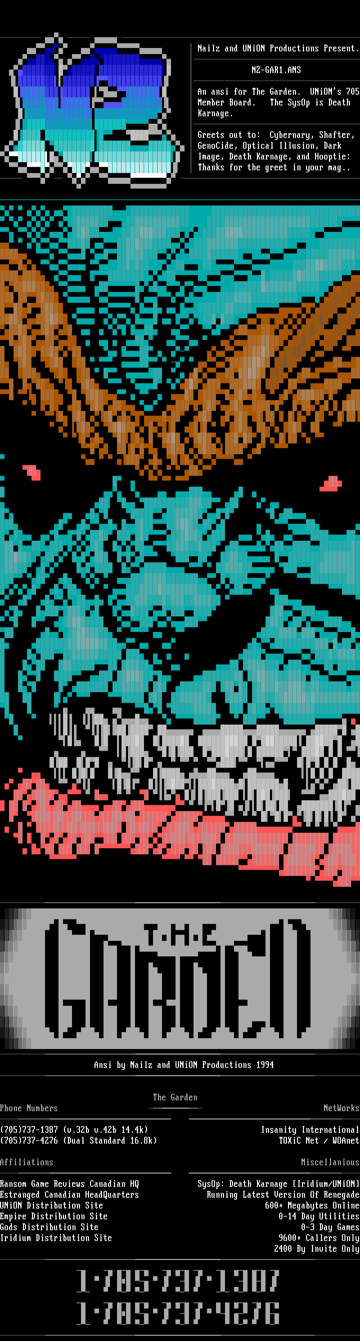 An ansi for The Garden. UNiONs 705 Member Board. The SysOp is Death