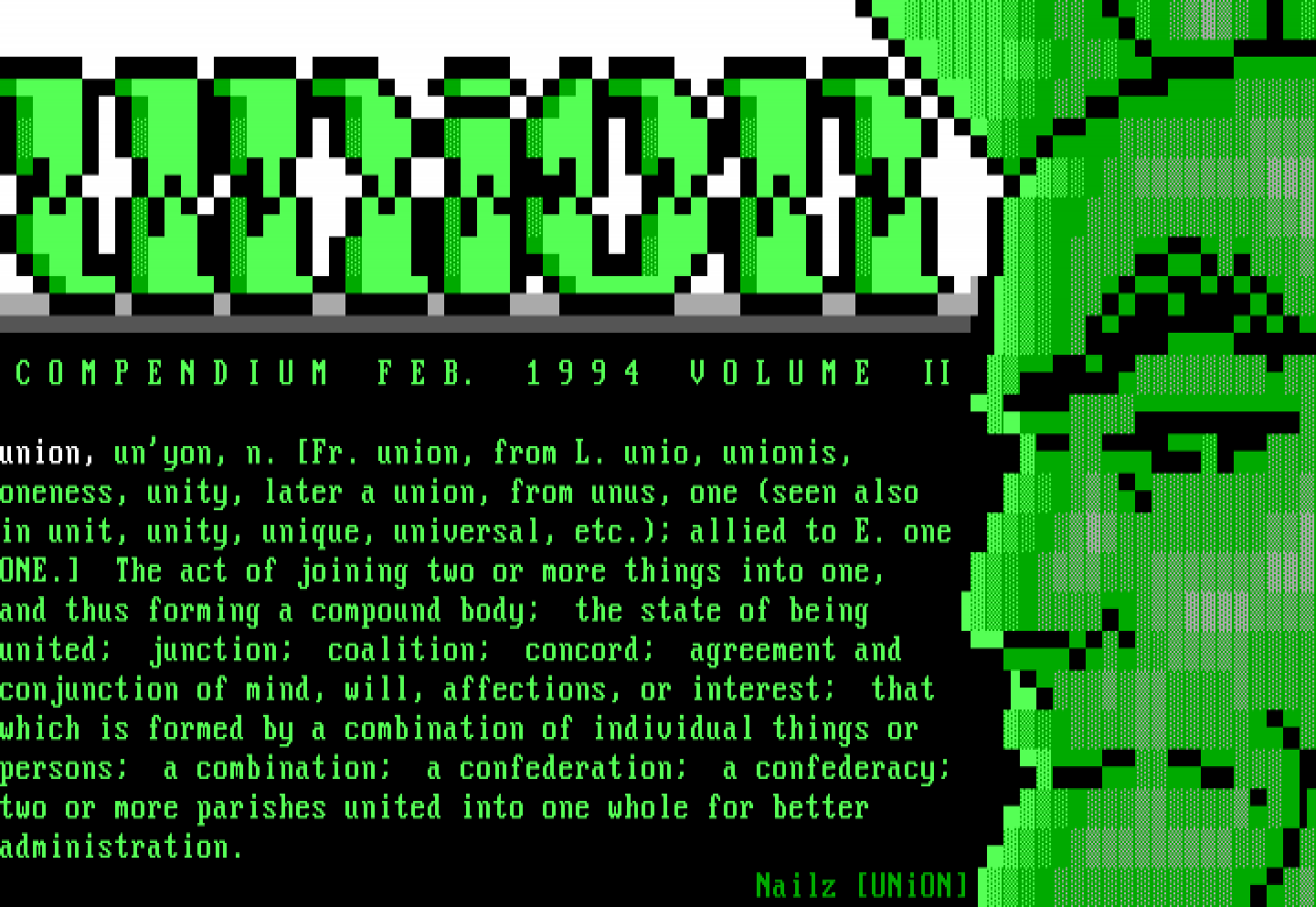 C O M P E N D I U M F E B. 1 9 9 4 V O L U M E II union, unyon, n. Fr. union, from L. unio, unionis, oneness, unity, later a union, from unus, one seen also in unit, unity, unique, universal, etc. allied to E. one ONE. The act of joining two or more things into one, and thus forming a compound body the state of being united junction coalition concord agreement and conjunction of mind, will, affections, or interest that which is formed by a combination of individual things or persons a combination a confederation a confederacy