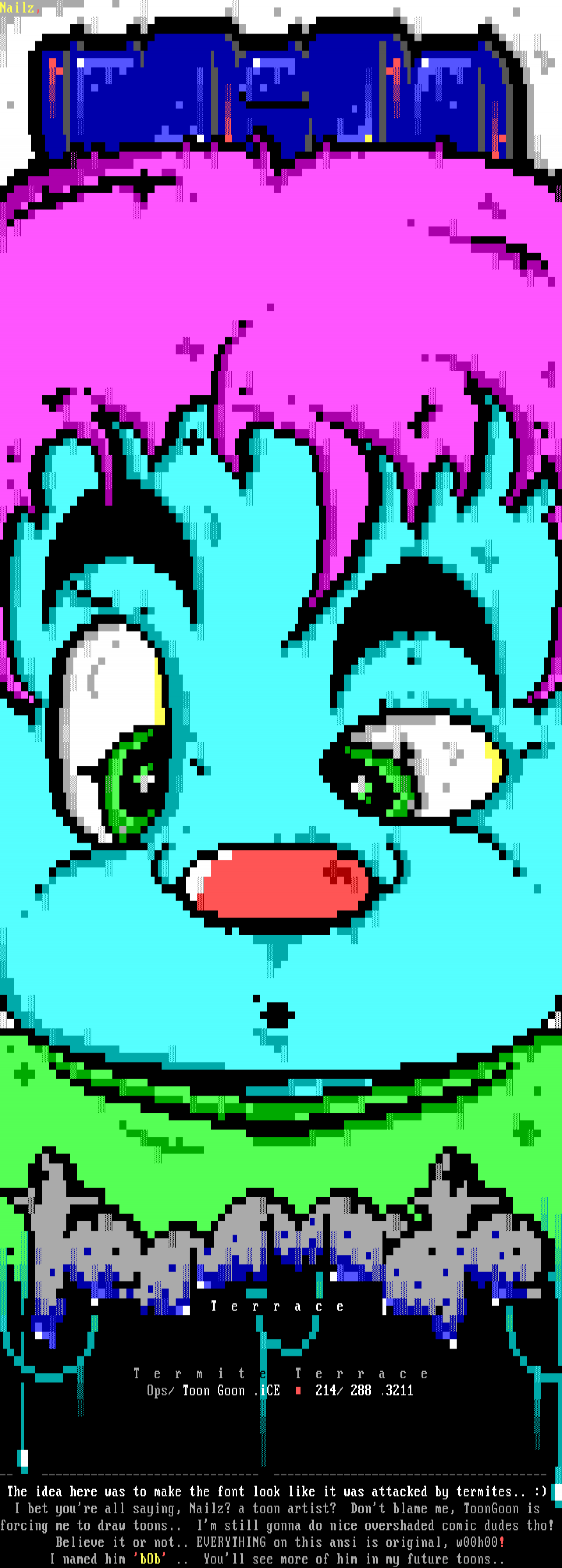 The idea here was to make the font look like it was attacked by termites.. : I bet youre all saying, Nailz? a toon artist? Dont blame me, ToonGoon is forcing me to draw toons.. Im still gonna do nice overshaded comic dudes tho!