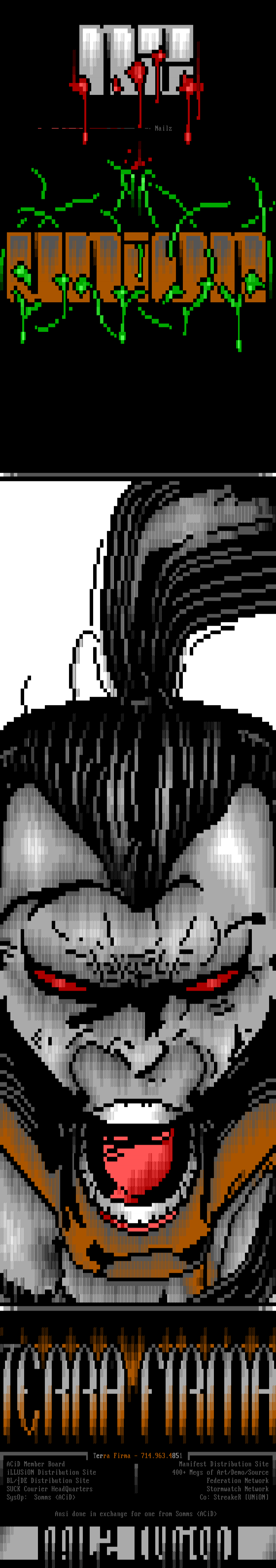 Terra Firma - 714.963.4851 ACiD Member Board Manifest Distribution Site iLLUSiON Distribution Site 400+ Megs of Art/Demo/Source BL/DE Distribution Site Federation Network SUCK Courier HeadQuarters Stormwatch Network