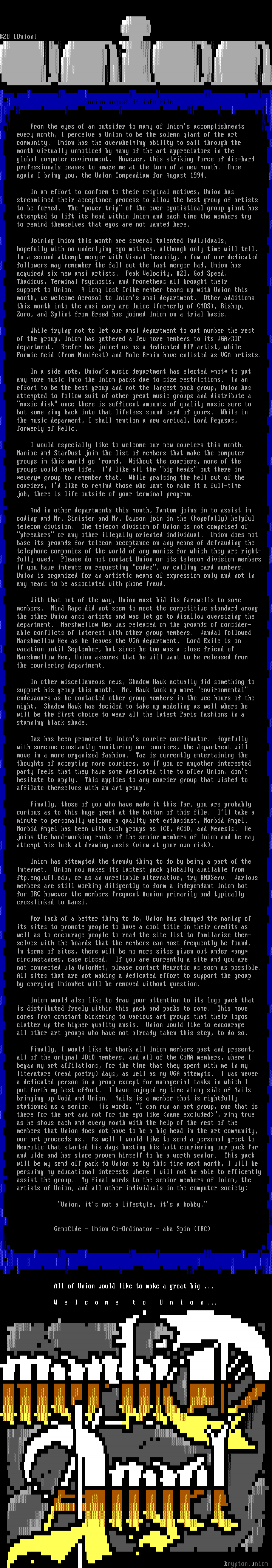 support to Union. A long lost Tribe member teams up with Union this month, we welcome Aerosol to Unions ansi department. Other additions this month into the ansi camp are Juice formerly of CMOS, Bishop, Zoro, and Splint from Breed has joined Union on a trial basis. While trying not to let our ansi department to out number the rest of the group, Union has gathered a few more members to its VGA/RIP