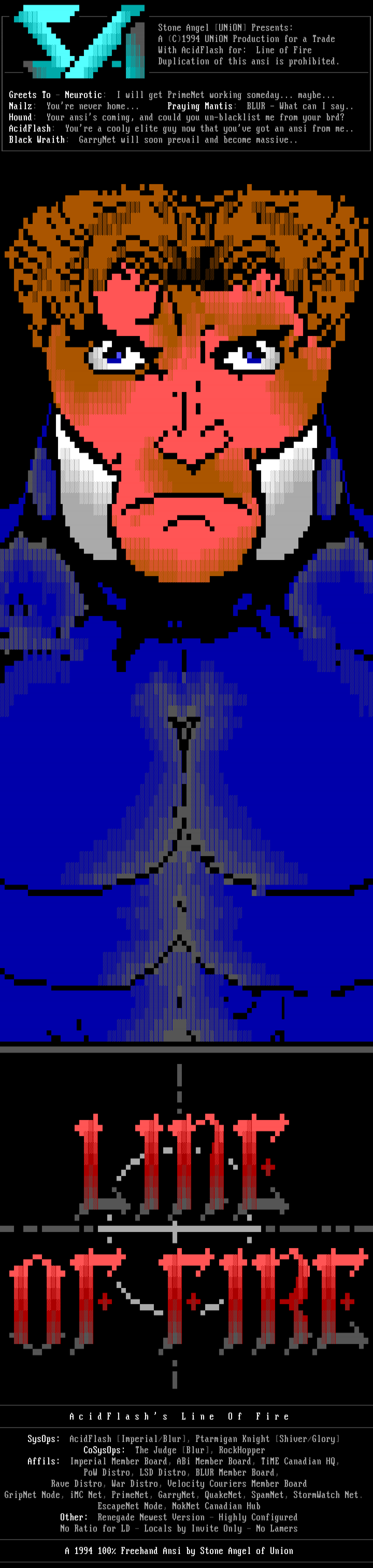 Stone Angel UNiON Presents: A C1994 UNiON Production for a Trade With AcidFlash for: Line of Fire Duplication of this ansi is prohibited. Greets To - Neurotic: I will get PrimeNet working someday... maybe... Nailz: Youre never home... Praying Mantis: BLUR - What can I say.. Hound: Your ansis coming, and could you un-blacklist me from your brd? AcidFlash: Youre a cooly elite guy now that youve got an ansi from me.. Black Wraith: GarryNet will soon prevail and become massive..