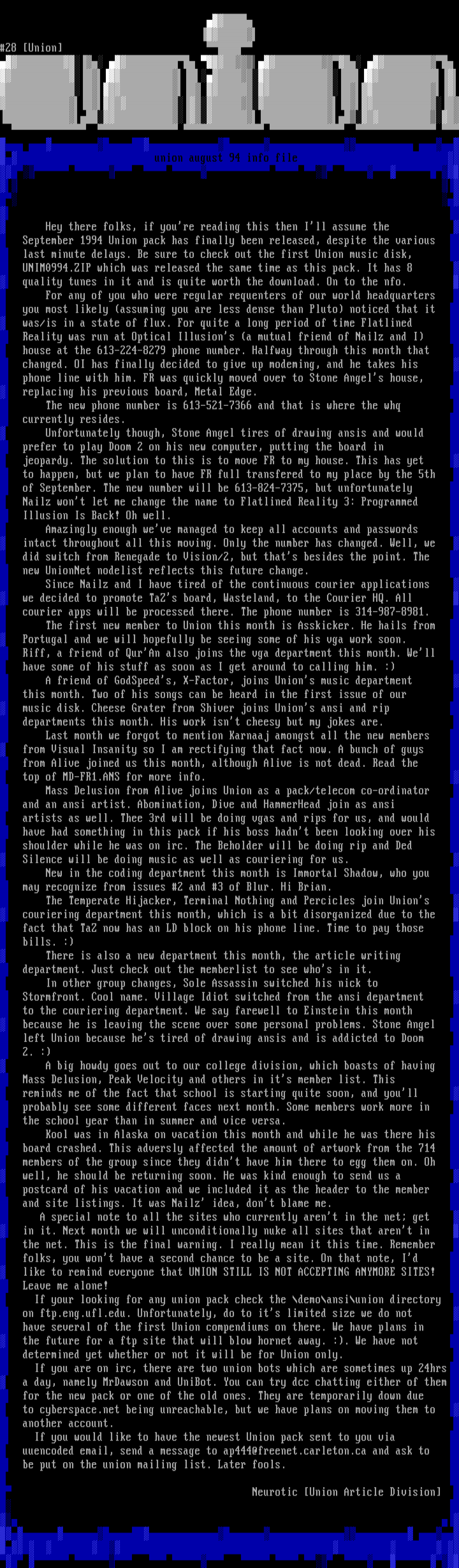 September 1994 Union pack has finally been released, despite the various last minute delays. Be sure to check out the first Union music disk, UNIM0994.ZIP which was released the same time as this pack. It has 8