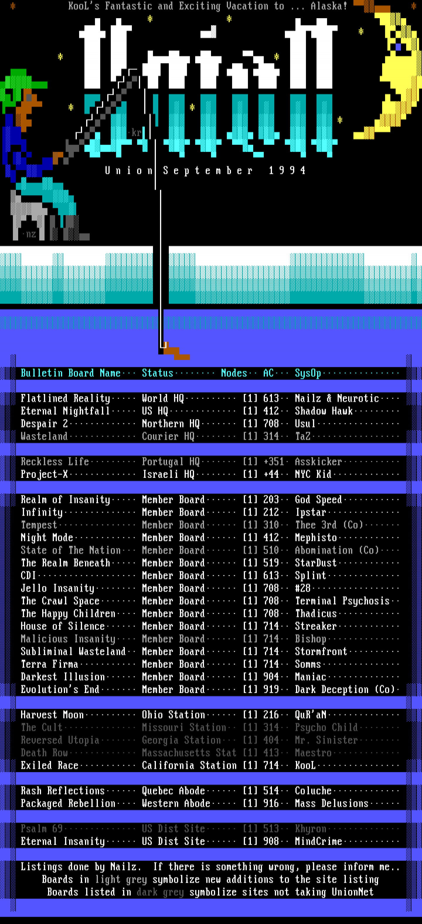 Bulletin Board Name Status Nodes AC SysOp Flatlined Reality World HQ 1 613 Nailz Neurotic Eternal Nightfall US HQ 1 412 Shadow Hawk Despair 2 Northern HQ 1 708 Usul Wasteland Courier HQ 1 314 TaZ Reckless Life Portugal HQ 1 +351 Asskicker Project-X Israeli HQ 1 +44 NYC Kid Realm of Insanity Member Board 1 203 God Speed Infinity Member Board 1 212 Ipstar Tempest Member Board 1 310 Thee 3rd Co Night Mode Member Board 1 412 Mephisto State of The Nation Member Board 1 510 Abomination Co The Realm Beneath Member Board 1 519 StarDust CDI Member Board 1 613 Splint Jello Insanity Member Board 1 708 28 The Crawl Space Member Board 1 708 Terminal Psychosis The Happy Children Member Board 1 708 Thadicus House of Silence Member Board 1 714 Streaker Malicious Insanity Member Board 1 714 Bishop Subliminal Wasteland Member Board 1 714 Stormfront Terra Firma Member Board 1 714 Somms Darkest Illusion Member Board 1 904 Maniac Evolutions End Member Board 1 919 Dark Deception Co Harvest Moon Ohio Station 1 216 QuRaN The Cult Missouri Station 1 314 Psycho Child Reversed Utopia Georgia Station 1 404 Mr. Sinister Death Row Massachusetts Stat 1 413 Maestro Exiled Race California Station 1 714 KooL Rash Reflections Quebec Abode 1 514 Coluche Packaged Rebellion Western Abode 1 916 Mass Delusions Psalm 69 US Dist Site 1 513 Khyron Eternal Insanity US Dist Site 1 908 MindCrime Listings done by Nailz. If there is something wrong, please inform me.. Boards in light grey symbolize new additions to the site listing Boards listed in dark grey symbolize sites not taking UnionNet
