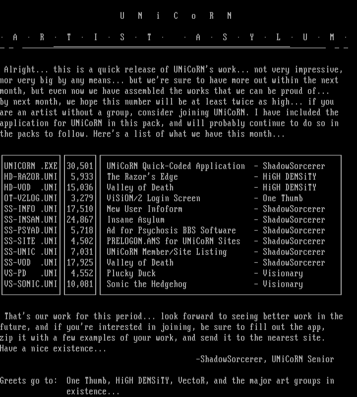Greets go to: One Thumb, HiGH DENSiTY, VectoR, and the major art groups in