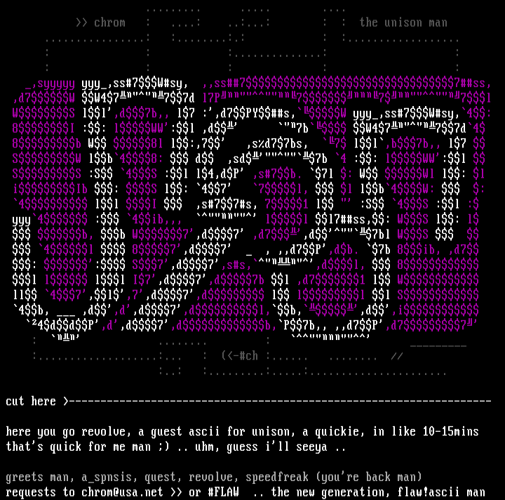 requests to chrom@usa.net or FLAW .. the new generation, flaw!ascii man