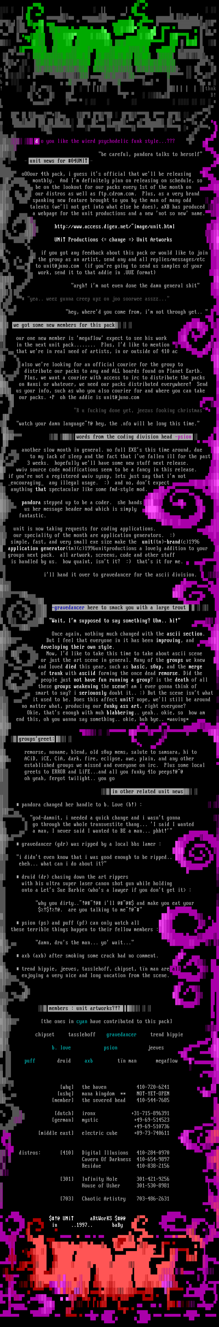 groups next pack. all artwork, screens, code and other stuff is handled by us. how quaint, isnt it? : thats it for me. ill hand it over to gravedancer for the ascii division.