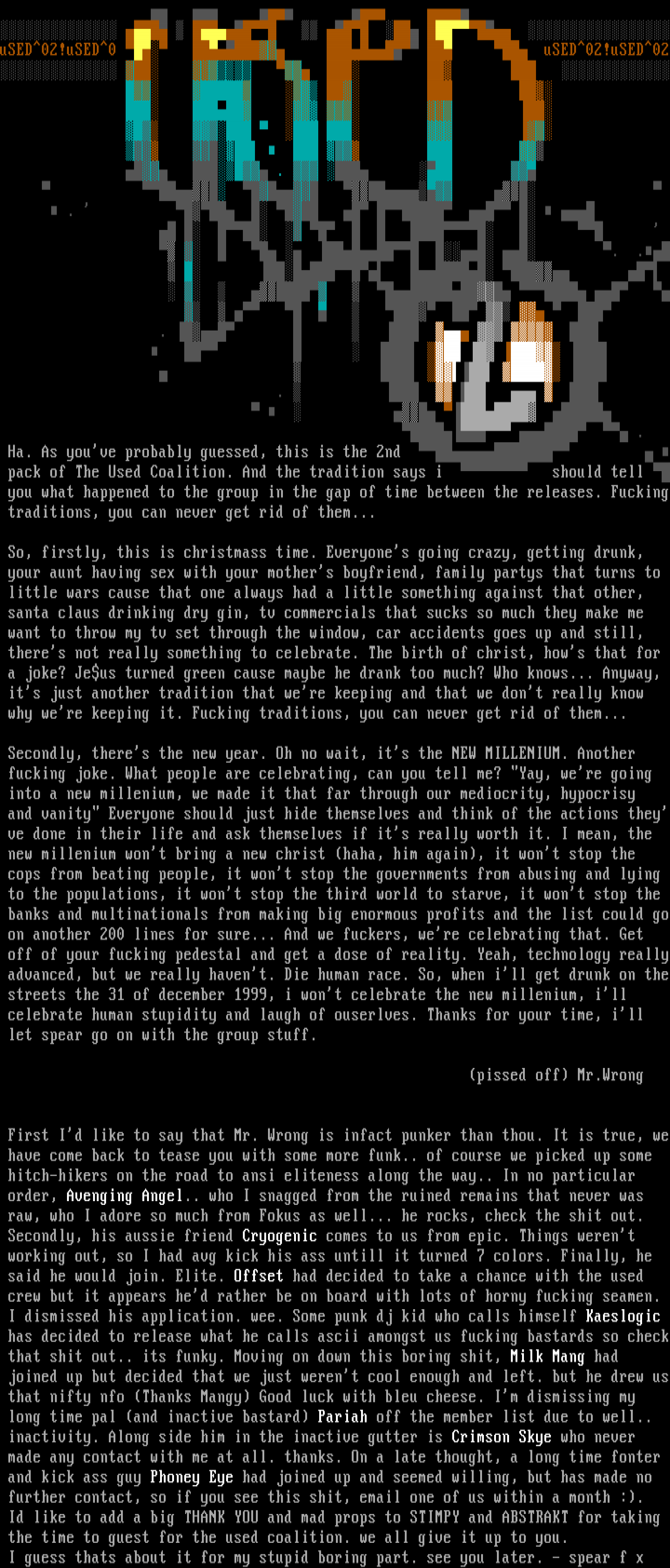 has decided to release what he calls ascii amongst us fucking bastards so check that shit out.. its funky. Moving on down this boring shit, Milk Mang had