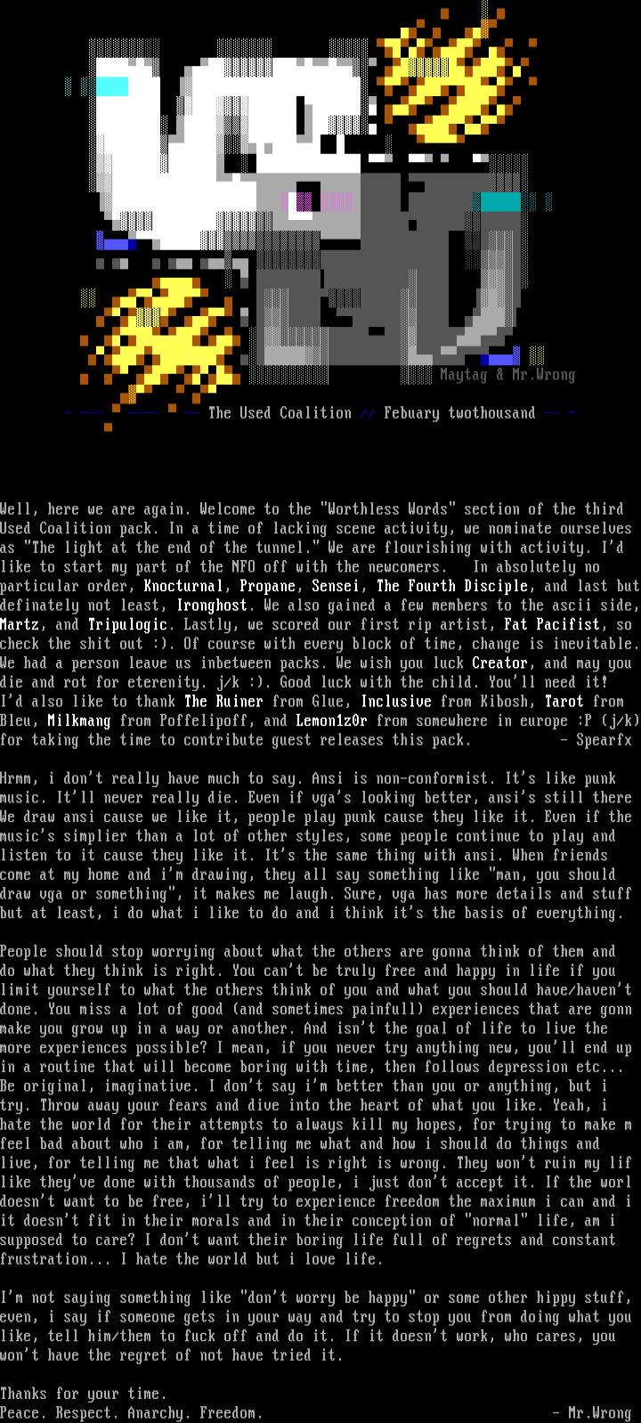 particular order, Knocturnal, Propane, Sensei, The Fourth Disciple, and last butdefinately not least, Ironghost. We also gained a few members to the ascii side,Martz, and Tripulogic. Lastly, we scored our first rip artist, Fat Pacifist, so
