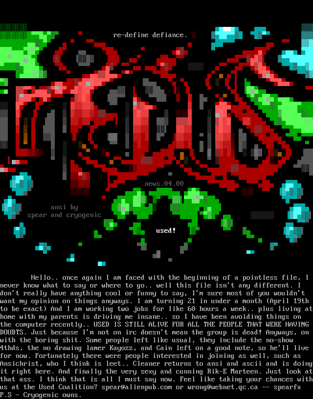 Ansichrist, who I think is leet.. Cleaner returns to ansi and ascii and is doingit right here. And finally the very sexy and cunning Rik-E Marteen. Just look atthat ass. I think that is all I must say now. Feel like taking your chances withus at the Used Coalition? spear@alienpub.com or wrong@webnet.qc.ca -- spearfx