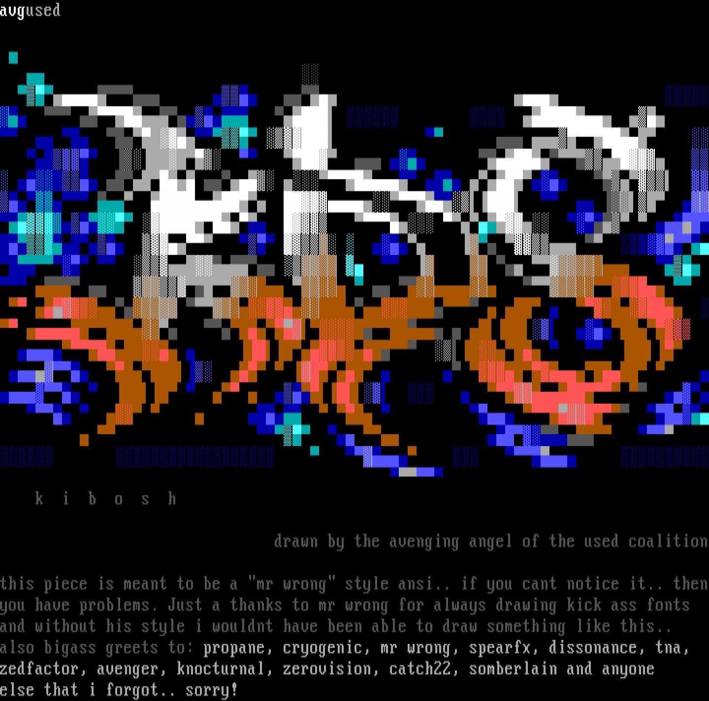 this piece is meant to be a mr wrong style ansi.. if you cant notice it.. thenyou have problems. Just a thanks to mr wrong for always drawing kick ass fonts