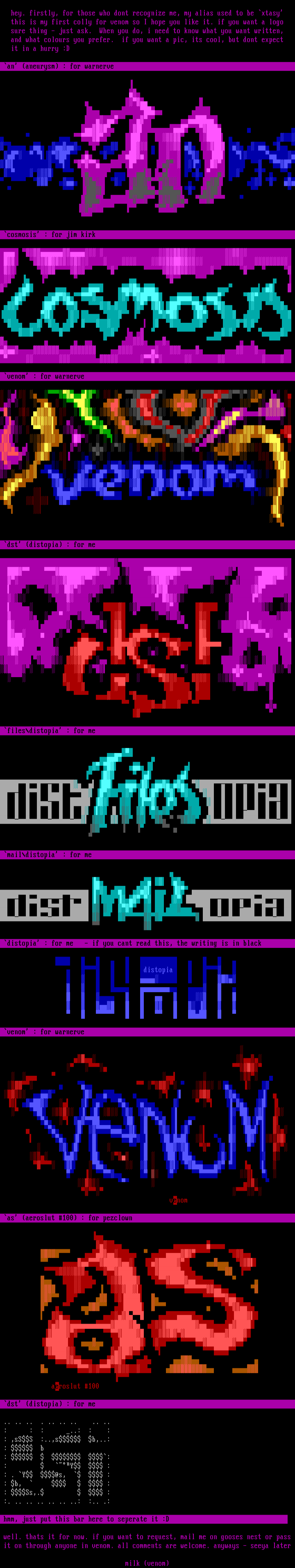 well. thats it for now. if you want to request, mail me on gooses nest or pass it on through anyone in venom. all comments are welcome. anyways - seeya later