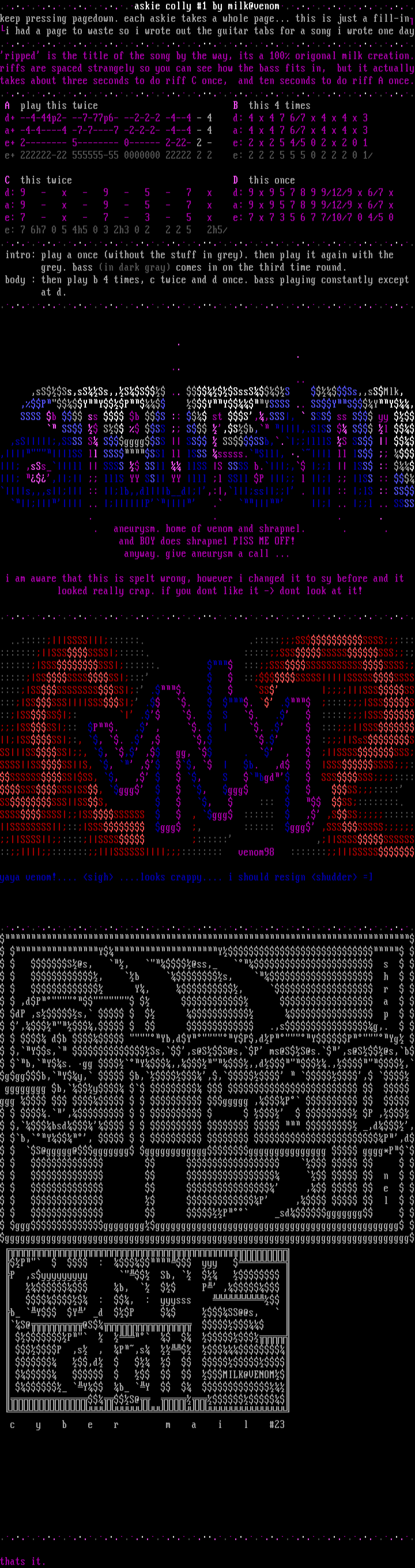 .............askie colly 1 by milk@venom.............keep pressing pagedown. each askie takes a whole page... this is just a fill-ini had a page to waste so i wrote out the guitar tabs for a song i wrote one day........................................ripped is the title of the song by the way, its a 100 origonal milk creation.riffs are spaced strangely so you can see how the bass fits in, but it actuallytakes about three seconds to do riff C once, and ten seconds to do riff A once......................................... A play this twice B this 4 times
