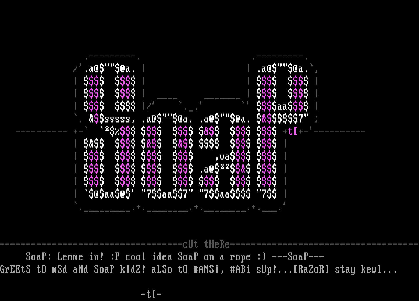 GrEEtS tO mSd aNd SoaP kIdZ! aLSo tO ANSi, ABi sUp!...RaZoR stay kewl...
